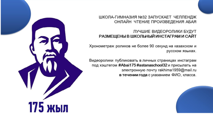 ❗️❗️❗️ШКОЛА-ГИМНАЗИЯ №32 ЗАПУСКАЕТ ЧЕЛЛЕНДЖ ОНЛАЙН ЧТЕНИЕ ПРОИЗВЕДЕНИЯ АБАЯ ✅ЛУЧШИЕ РАБОТЫ БУДУТРАЗМЕЩЕНЫ В ШКОЛЬНОМ ИНСТАГРАМ И САЙТЕ.❇️Хронометраж роликов не более 90 секунд на казахском и русском языках✳️Фото публиковать в личных страницах инстаграм под хештегом #Abai175#astanaschool32 и присылать на WhatsApp +7 7471202938до 30 апреля 2020 года с указанием ФИО, класса.